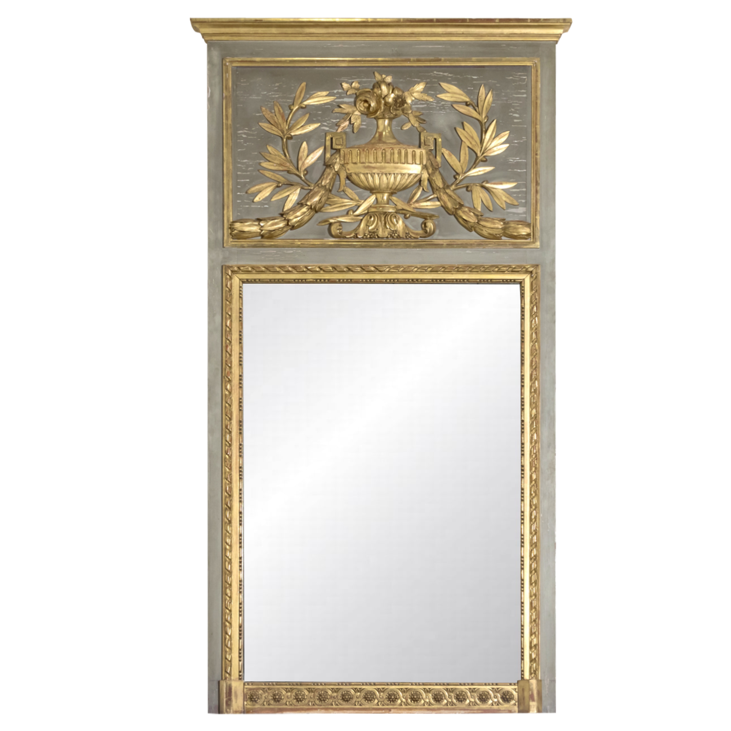 19th Century French Louis XVI Style Painted and Parcel Gilt Neoclassical Trumeau Mirror / Item #LOPH57 / Lolo French Antiques et More
