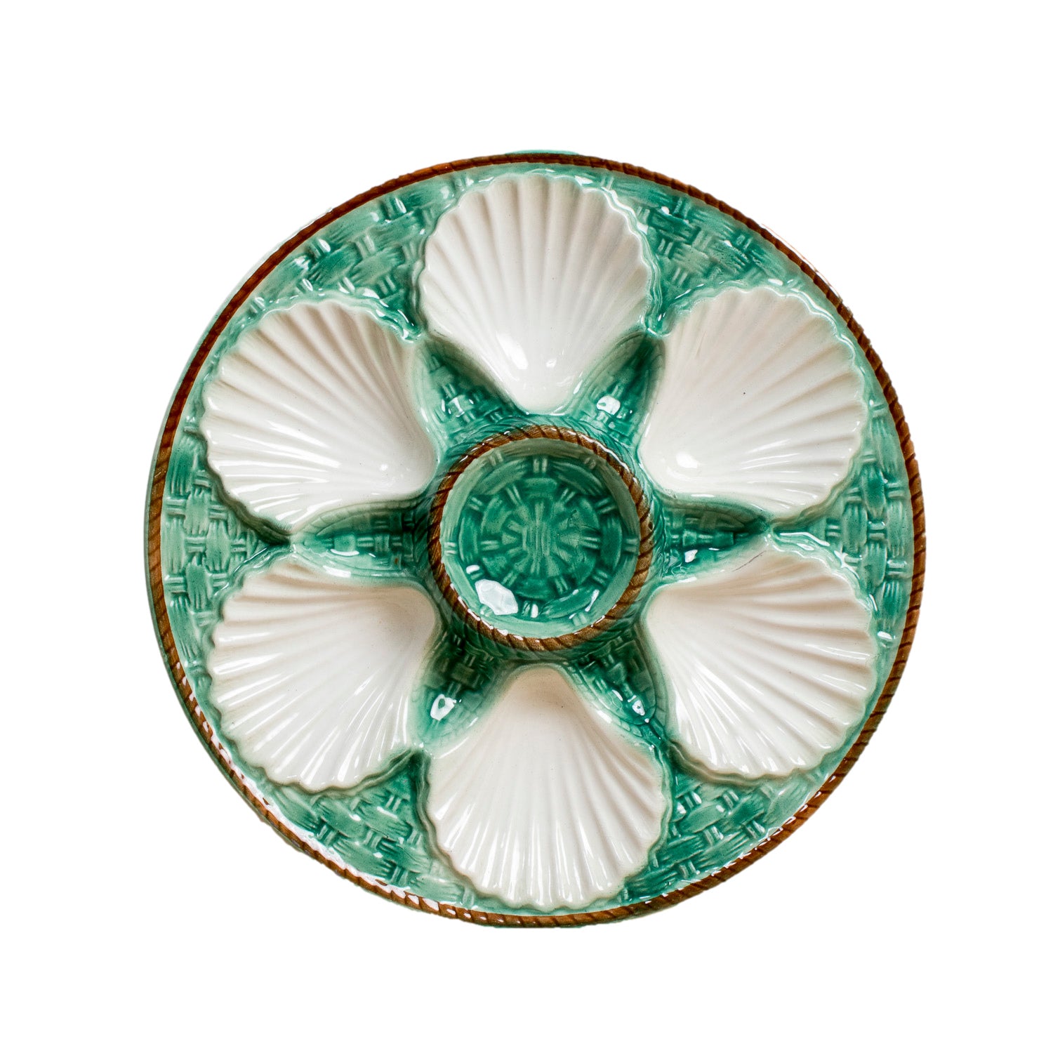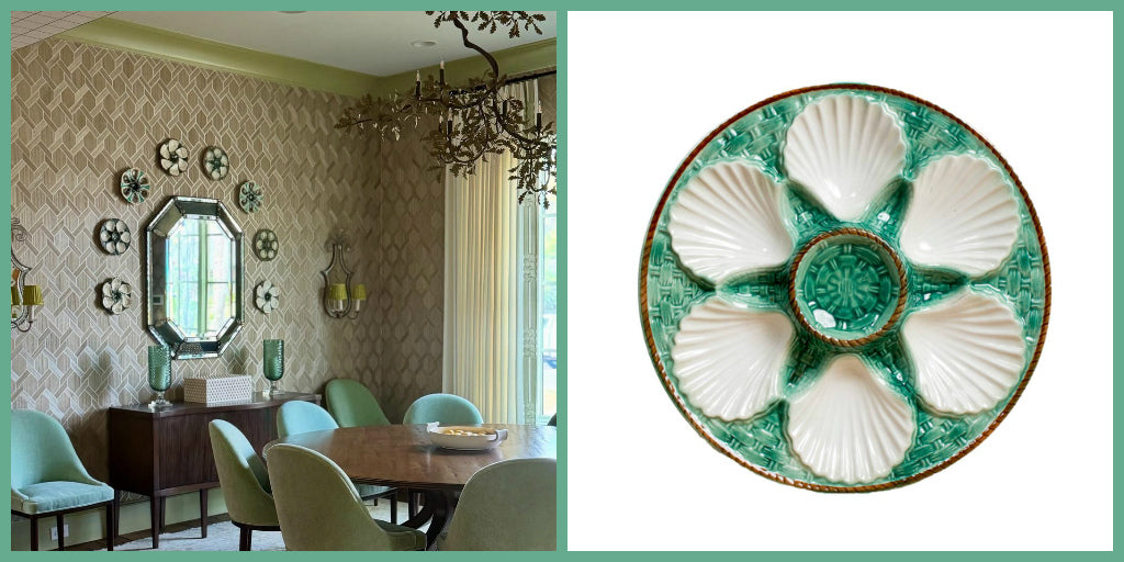 This week, it’s a stunning 19th century French oyster plate from St. Clément — creamy white scallop-shaped wells, a luminous jade green basketweave background, and a rich rope border. Styled beautifully by Laura Weaver Interiors in a coastal-inspired tablescape, in all its glossy majolica glory.
